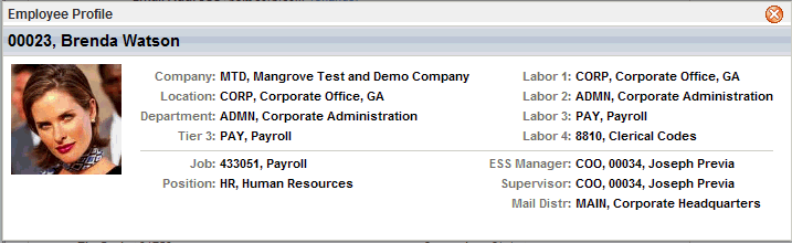 - Employee Profile. An "Employee Profile" link opens the Employee Profile. The Employee profile can show Company, Location, Department, Tier 3, Tier 4, Job, Position, Labor 1, Labor 2, Labor 3, Labor 4, ESS Manager, Supervisor, and Mail Distribution.
